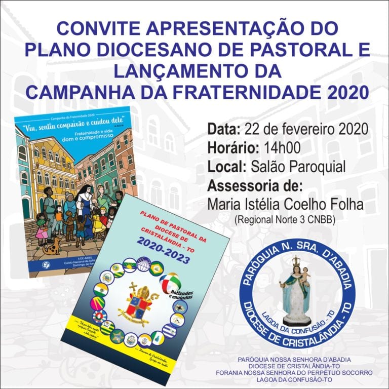 Eventos 28 de fevereiro de 2020 Convite para Encontro de formação CF 2020 – Paróquia Nossa Senhora D’Abadia | Lagoa da Confusão-TO LEIA MAIS