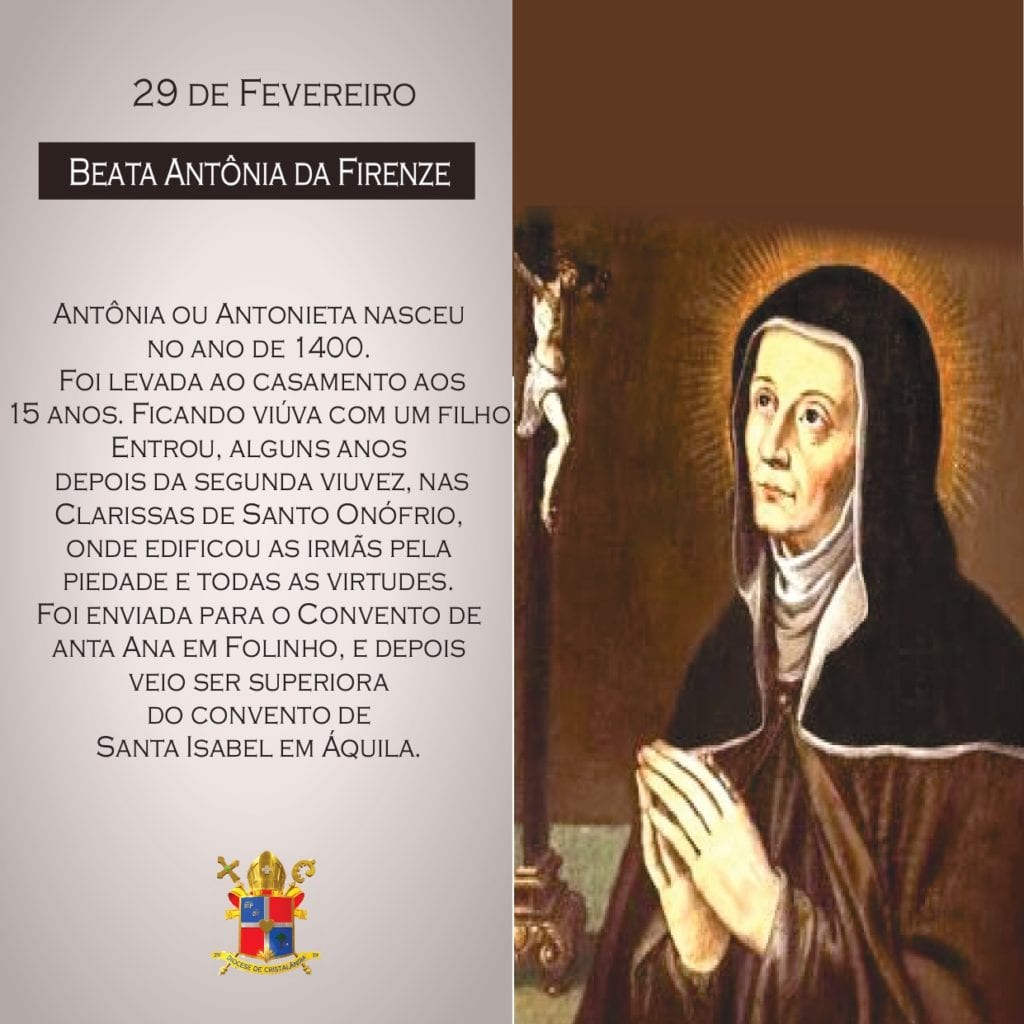 Antônia ou Antonieta nasceu no ano de 1400. Foi levada ao casamento aos 15 anos. Ficando viúva com um filho. Entrou, alguns anos depois da segunda viuvez, nas Clarissas de Santo Onófrio, onde edificou as irmãs pela piedade e todas as virtudes. Foi enviada para o Convento de Santa Ana em Folinho, e depois veio a ser superiora do convento de Santa Isabel em Áquila.
