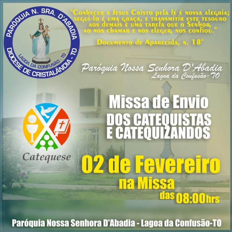 Eventos 29 de janeiro de 2020 CONVITE – MISSA DE ENVIO DOS CATEQUISTAS E CATEQUIZANDOS – Paróquia Nossa Senhora D’Abadia | lagoa da Confusão-TO LEIA MAIS
