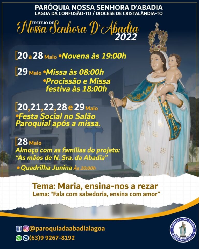 Eventos, Noticias da Igreja, Notícias das Paróquias, Pastorais e Movimentos 2 de maio de 2022 Festejo de Nossa Senhora D’Abadia – Lagoa da Confusão LEIA MAIS