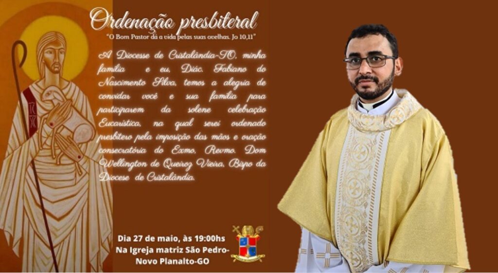 No próximo dia 27 de Maio nossa Diocese de Cristalândia estará em festa pela Ordenação Sacerdotal do Diácono Fabiano do Nascimento Silva. Convidamos a todos os fiéis de nossa Diocese a se unirem em oração pelo Diácono Fabiano para que ele possa exercer o Ministério Sacerdotal com amor, zelo e dedicação para o bem do povo de Deus e de toda comunidade eclesial.