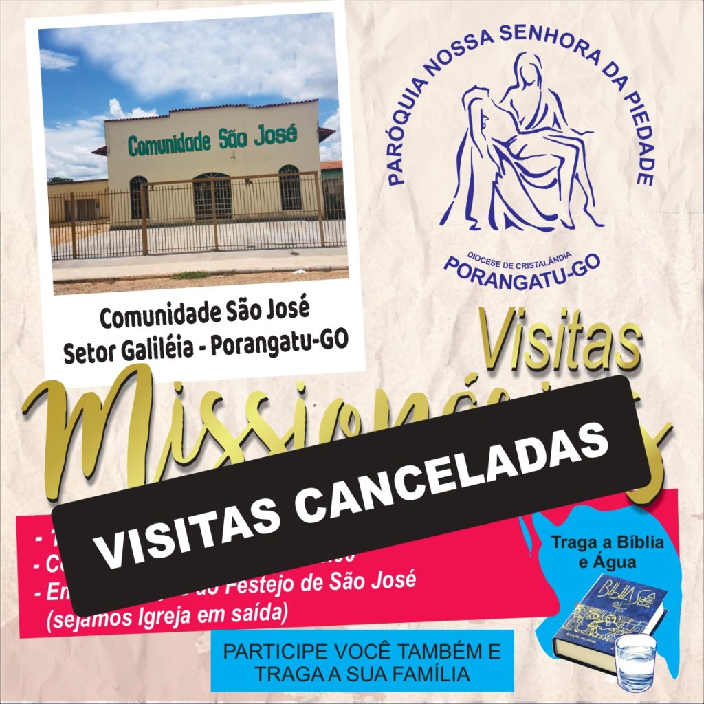 Paróquia Nossa Senhora da Piedade, em Porangatu-GO, comunica a todos o cancelamento das Visitas Missionárias que aconteceriam na comunidade São José do Setor Galiléia, neste último sábado 14/03. Por  PRECAUÇÃO ao Coronavírus.